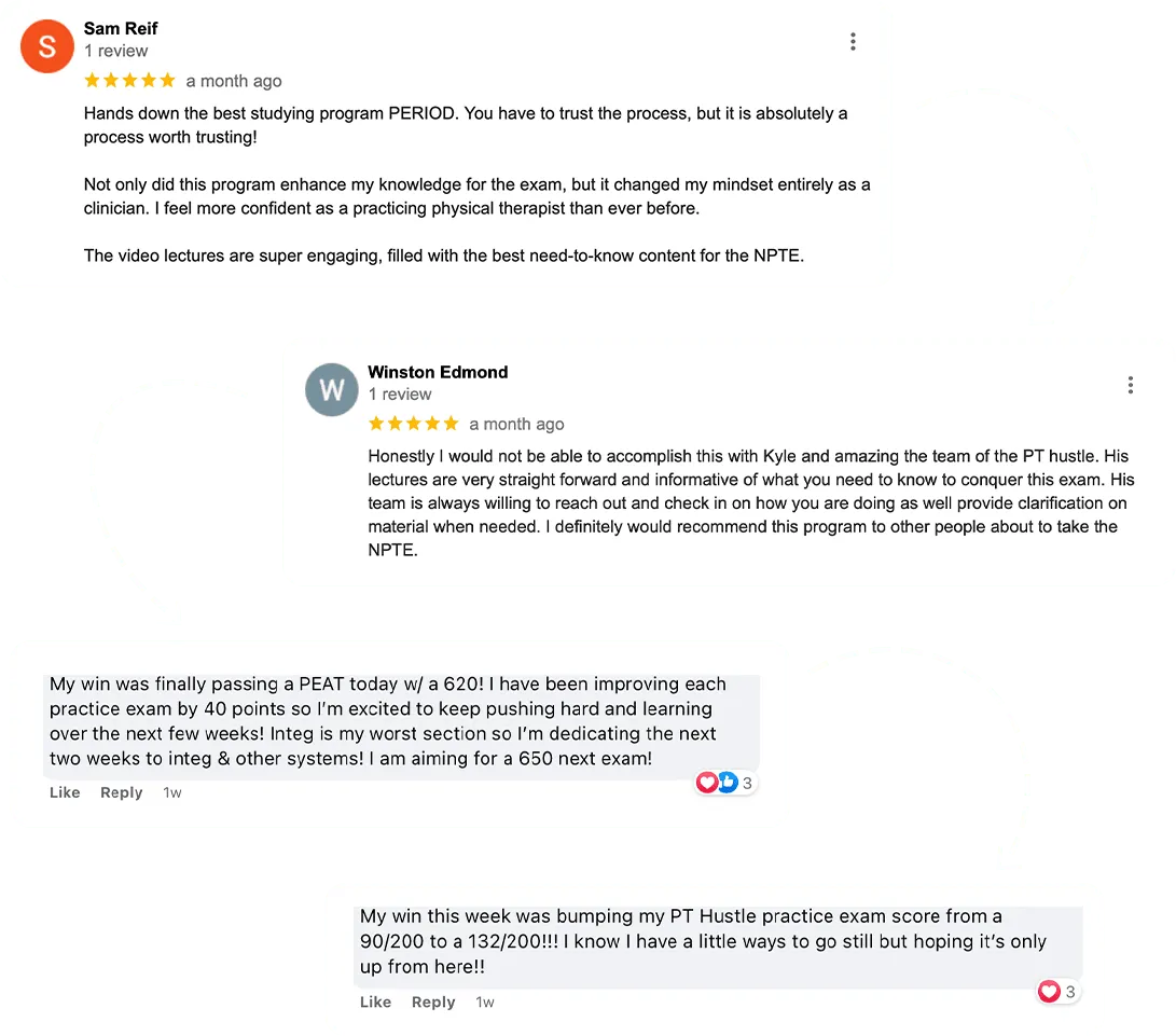 The PT Hustle, LLC is not affiliated with FSBPT or the NPTE. We do not guarantee results as exam outcomes are influenced by many factors such as personal effort, individual preparation, and test-taking ability. Our product is designed to provide study material and resources to help PT students prepare for the NPTE, but the ultimate outcome of the exam is the sole responsibility of the individual test-taker. Additionally, please be advised that any results displayed on our page or testimonials are not a guarantee of your personal exam results. The success of our program is dependent on individual efforts and performance, and your personal results may vary.